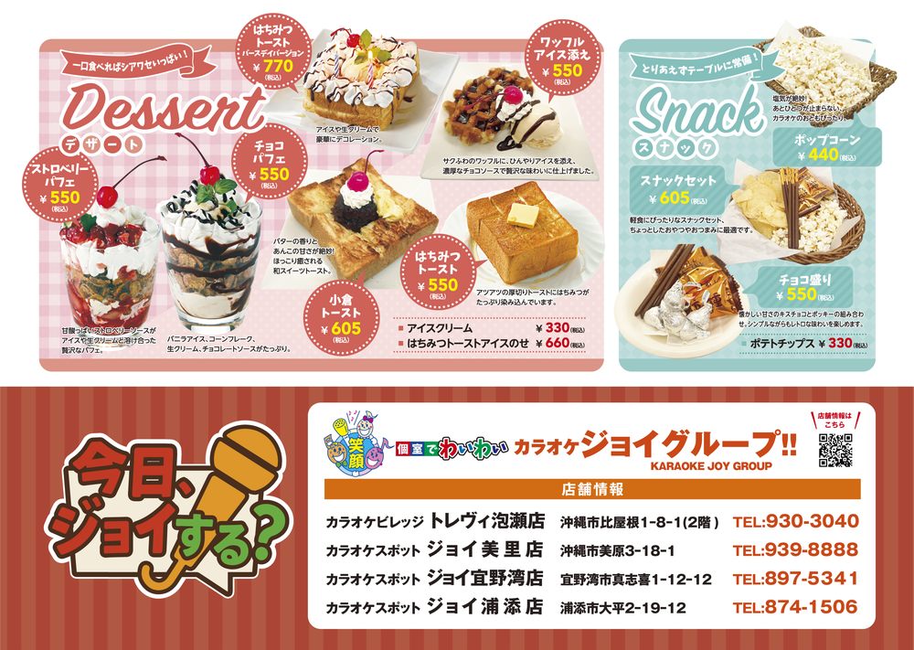 沖縄カラオケ店トレヴィ,ジョイはトレヴィ(泡瀬店),ジョイ(浦添店・美里店・宜野湾店)を運営しています。メール会員募集中!